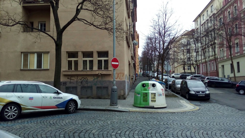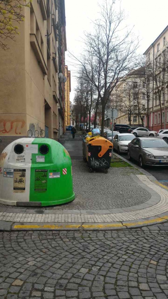 Kontejnery na trideni odpadu jsou umistene v strede chodniku. Tohle neni ich misto, prosim dejte je jinde. Dekuji.