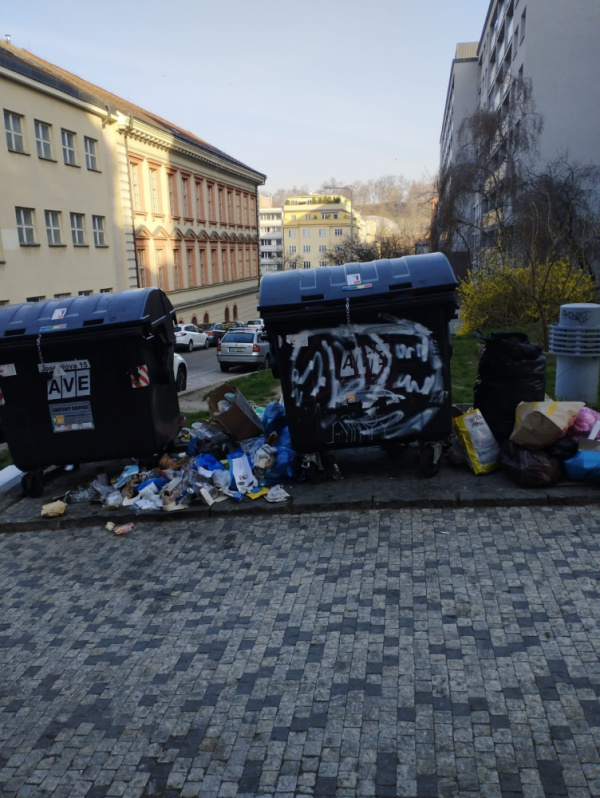 děkujeme za Váš podnět. Kontejnery se nachází na soukromém pozemku SVJ a situace je v řešení s MČ P-3.