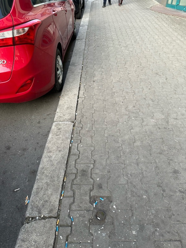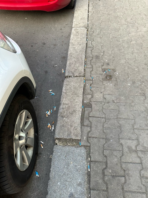 Pravidelně házení nedopalku u ubytovny. Před a po. Cca 20 metru nahoru a dolu všude nedopalky.