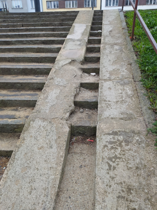 Poškozený a téměř nepoužitelný nájezd pro kočárky na schodech vedoucích k Olšanským hřbitovům.