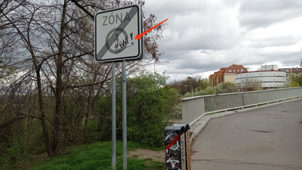 U ulice Pod Krejcárkem se naproti lampě 302 137 nachází posprejovaná oboustranná sestava DZ.