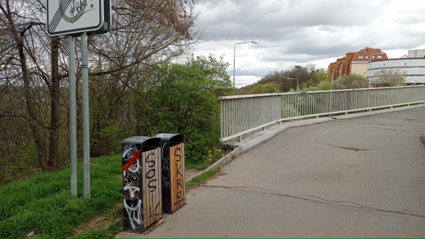 U ulice Pod Krejcárkem se naproti lampě 302 137 nachází posprejovaná dvojice odpadkových košů.
