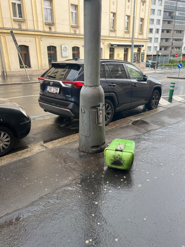 Koš se valí na chodniku