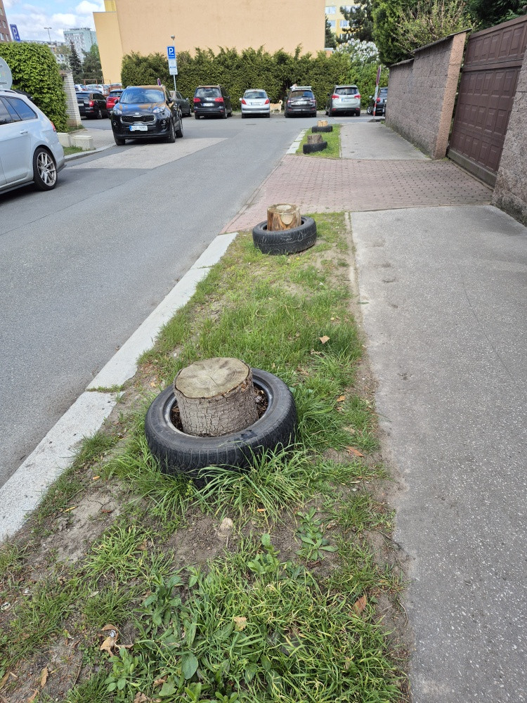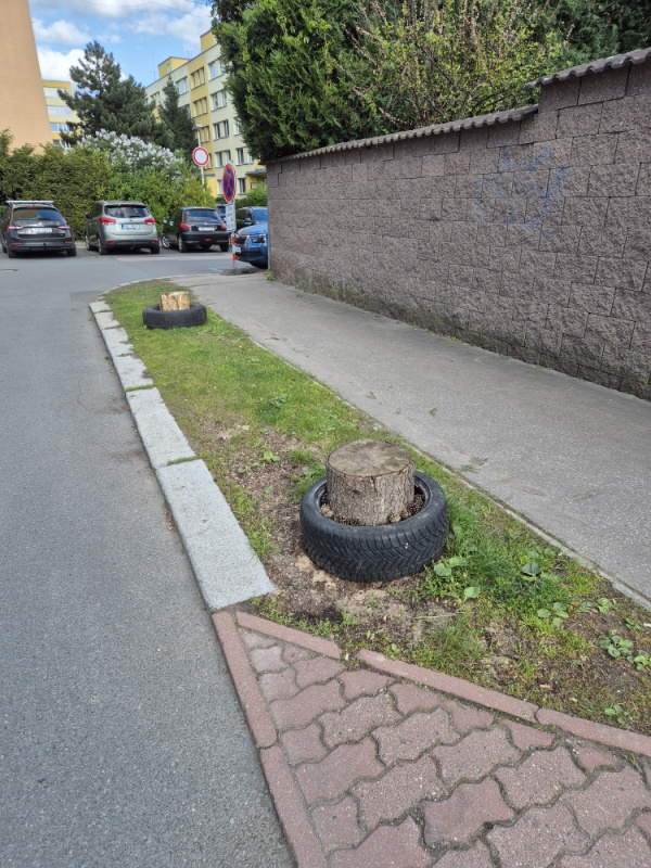 Pneumatiky jako zabrana proti parkovani. Je to spravne reseni? Funkcni snad, hezke urcite ne.