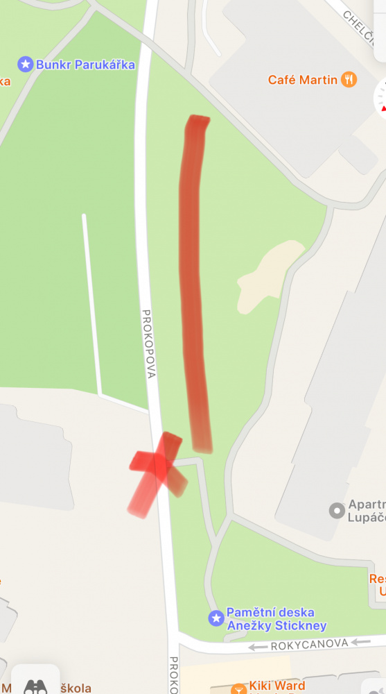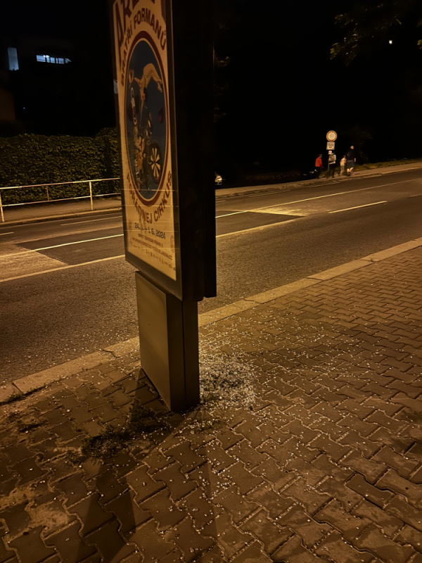 Již několik dní vysklený reklamní stojan (city light) na Prokopově, mezi Jeseniovou a viaduktem, střepy všude kolem po celém chodníku, je to velmi nebezpečné pro děti i psy, prosím o zametení. Další věc je kousek vedle “pěšina” nad hřištěm v Lupáčově ulici, kde je de facto skládka, zároveň si tam děti odbíhají hrát. Oboje vyznačeno na přiložené mapce.Děkuji