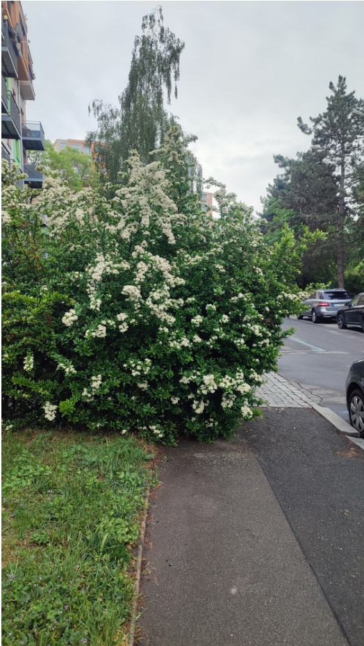 Prosím o zastřihnutí keře, který přerůstá na chodník.