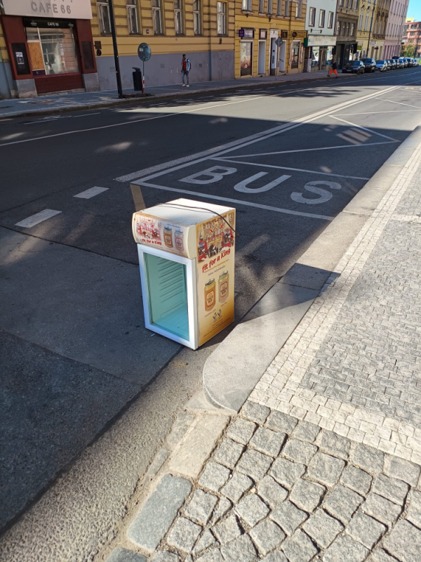 odložená mini lednička před vjezdem do dvora na uvedené adrese a zasahující i do zastávky