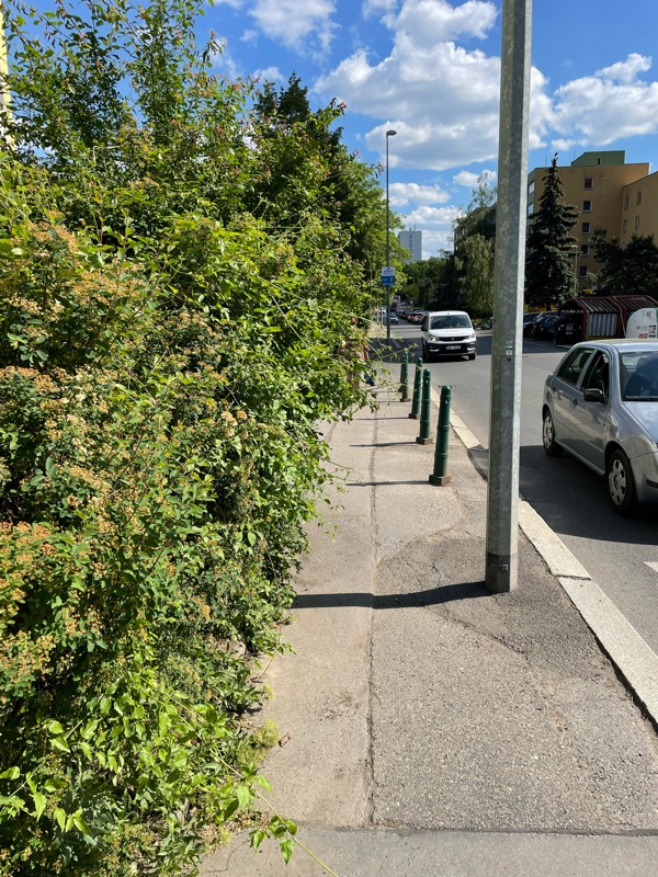 Keř zde zužuje chodník pro max jednoho chodce