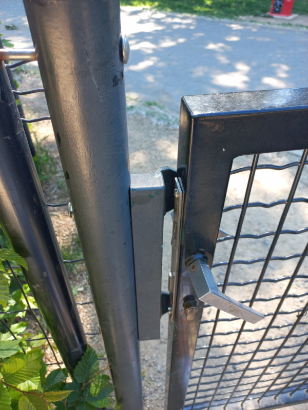 Rozbité branky na dětském hřišti u kempu, které nejdou zavřít.