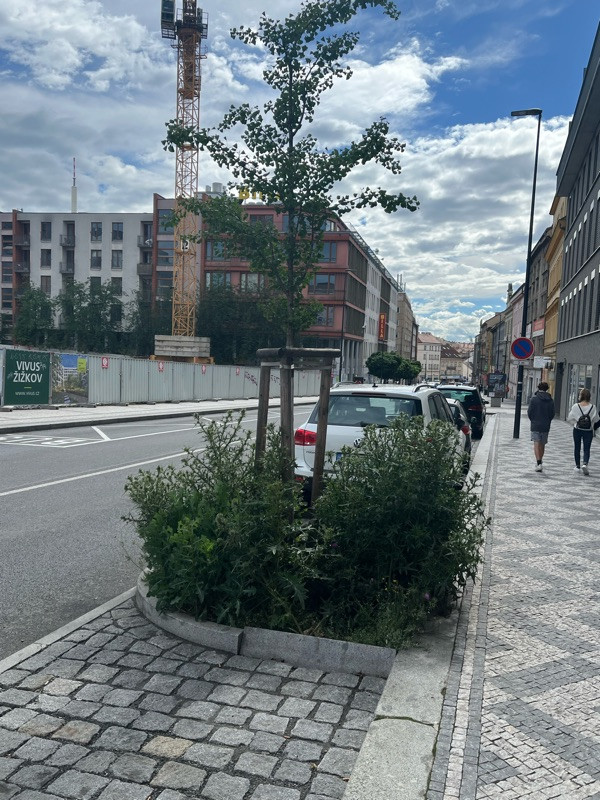 Okolo stromů mezi zastávkou Lukášova - Černinova je vzrostlé bodláčí a jiny prkos.