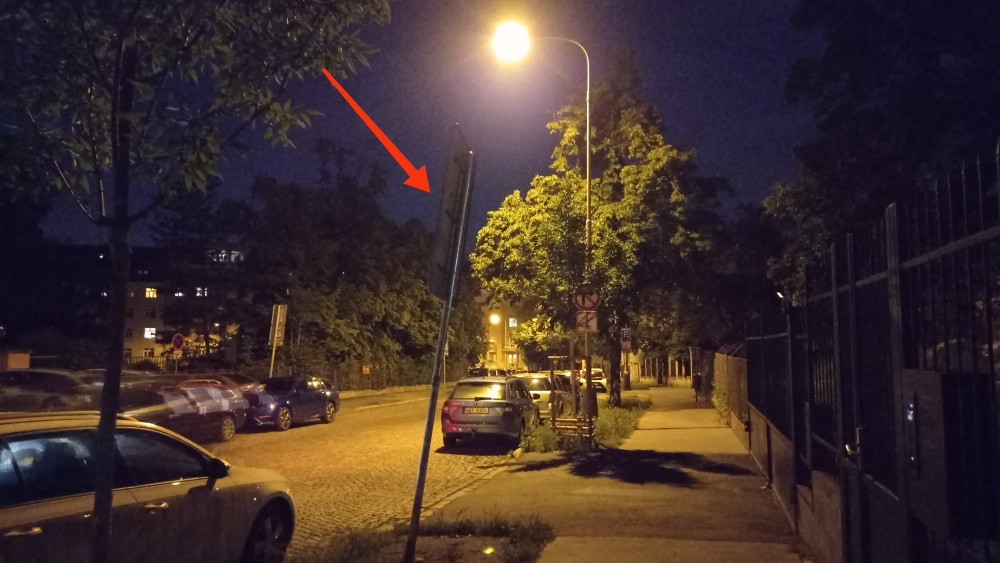 V ulici Ambrožova se u lampy 303 463 nachází částečně přetočená tabule DZ.