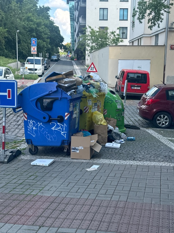 Roh Kalisnicka a domazlicka, od pondělí kdy jsem problém hlásila se nic nestalo. Ulice je z důvodu opravy Hartigova obousměrná, neměly by stát ve větším úseku auta, ale ty tam stojí, MP to neřeší. Odhaduji ze popeláři nemohou ani přijet!