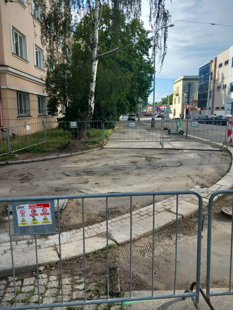 Uzavřený chodník. Není nijak značeno, že je chodník uzavřen. Zároveň jsou zde zakázkové značky, které již dle data neplatí.