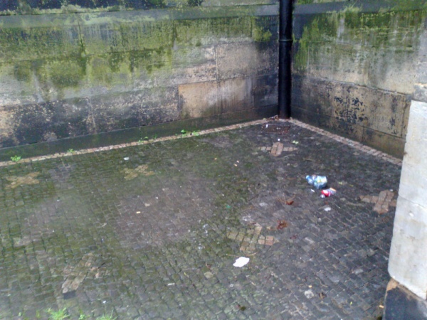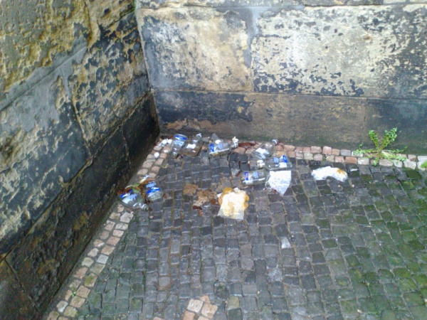 Odpadky a lidské exkrementy v rozích kostela; odpadky v zeleni - viz foto. Prosím, projděte celý obvod kostela.