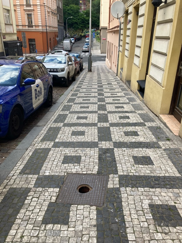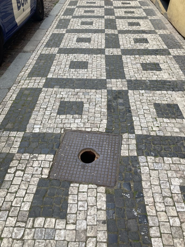 Chybějící kryt kanálu, v Jeronýmově ulici, Praha 3 mezi domy č. 6 a 4.