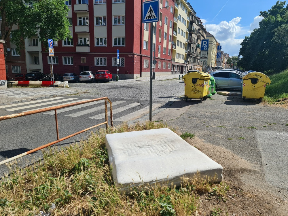 Odložená matrace u přechodu pro chodce na křižovatce Jeseniova a Zelenky Hajského.