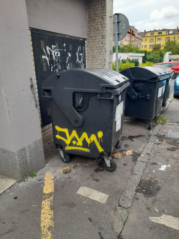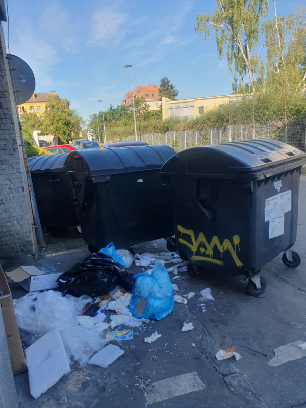 opět je nepořádek kolem kontejnerů na odpad, naproti vchodu do kempu Pražačka.