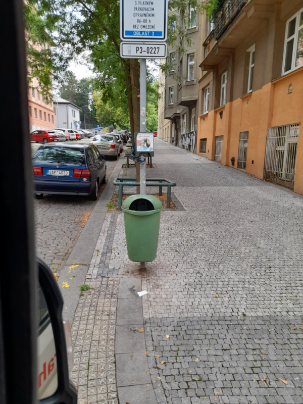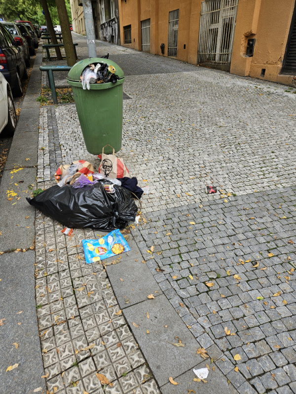 Nepořádek kolem koše na rohu Hájkova / Žerotínova