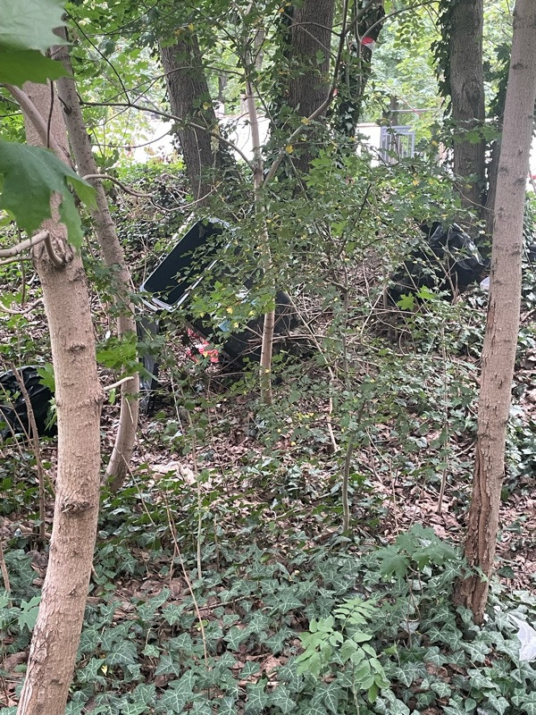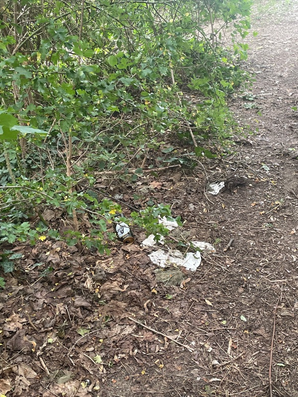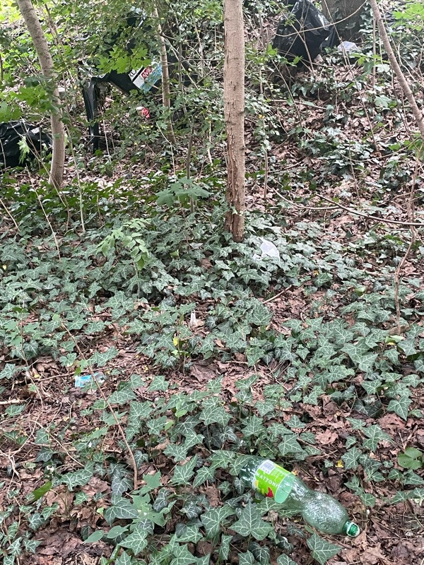 Nepořádek a pohozena popelnice v lesíku mezi Rezidenci a Olsanskymi hrbitovy
