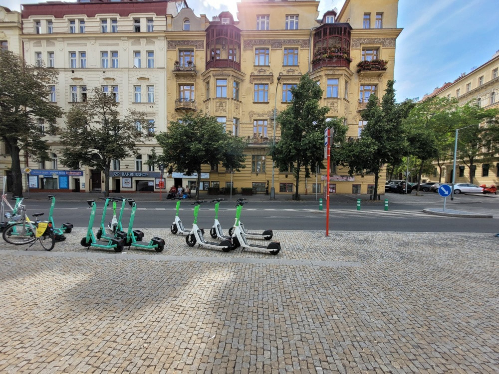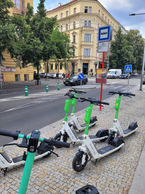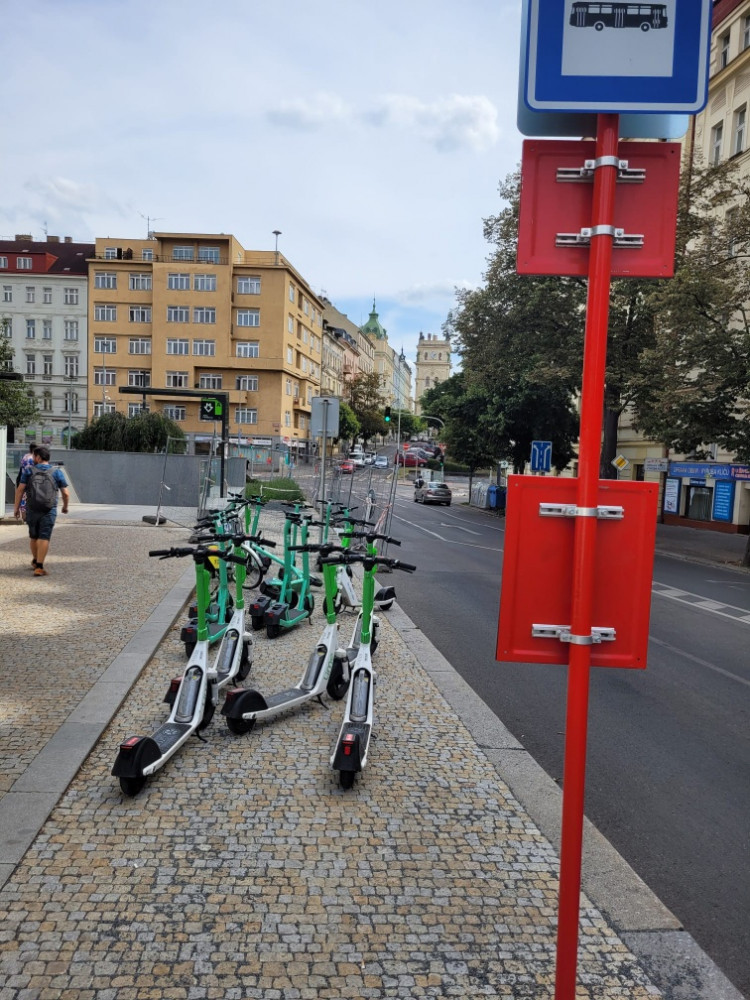 parkující el.koloběžky na zastávce MHD.Nám.Jiřího z Poděbrad.