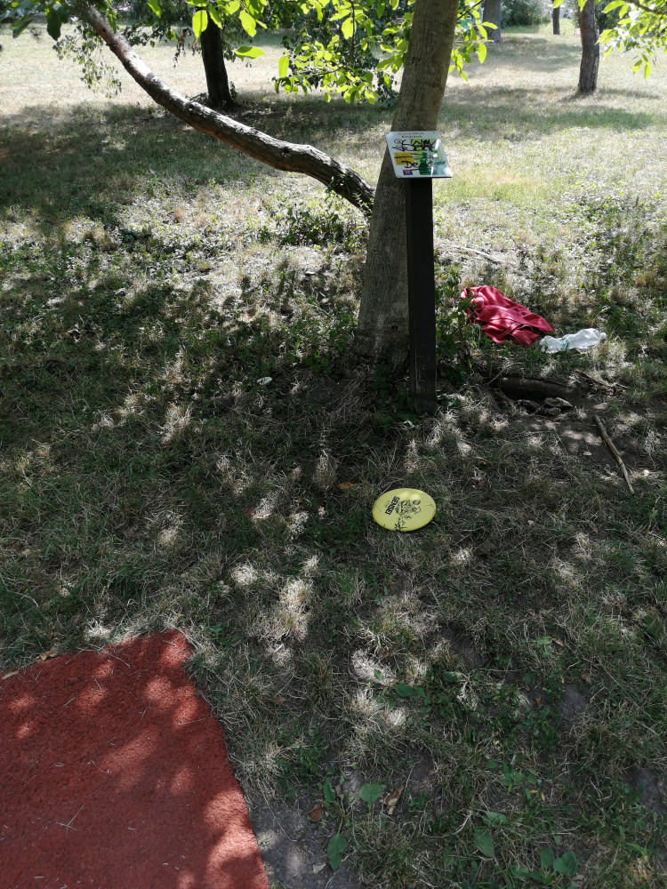 Vylomený sloupek na startu "jamky" č. 5 na Discgolfu na Krejcárku. Je tam. Opřený o strom. Díky =)