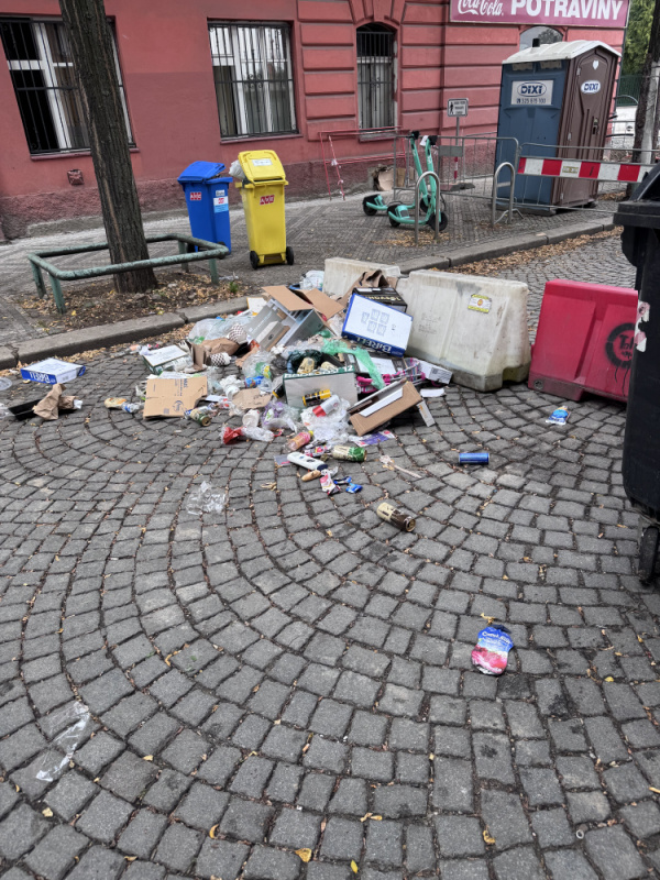 Na ulici Zelenky-Hajského před číslem popisným 15 je vysypaný celý kontejner na odpadky a popeláři Vyvezou vždycky jen popelnice a odpadky tady nechají