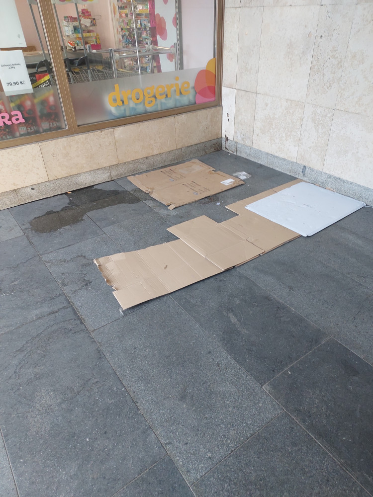 Opět kartony ve vstupu do metra na Jiřího z Poděbrad.