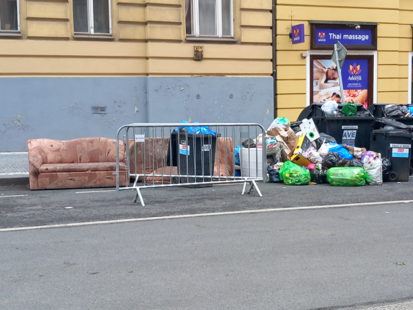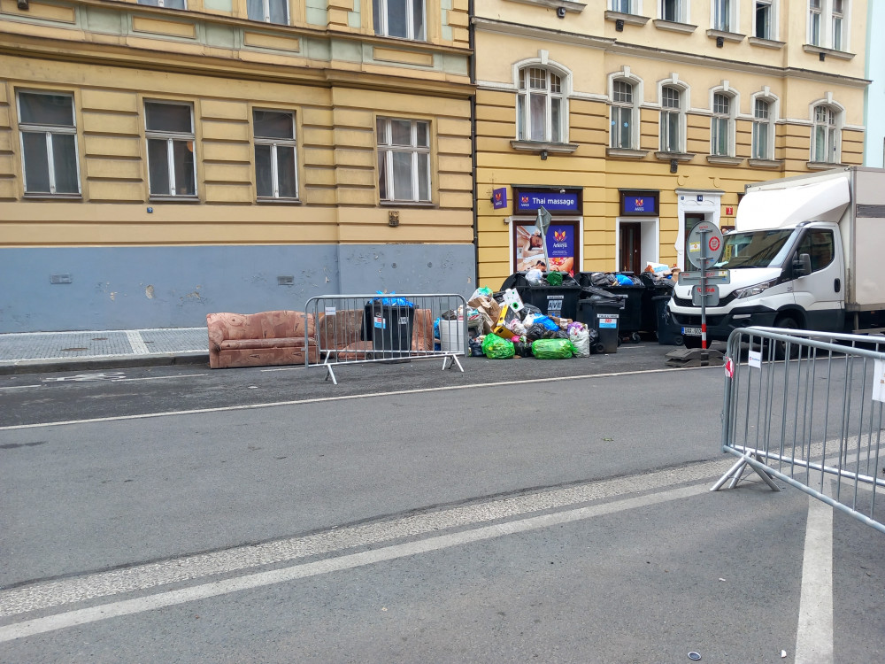 vyhozený gauč a stará lednička na ulici vedle kontejnerů na adrese Hartigova 62-66