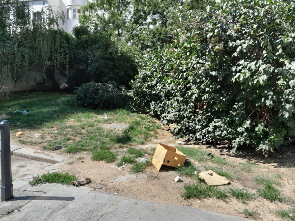 krabice u trávníku vedle vjezdu do garáží v Baranove ulici.