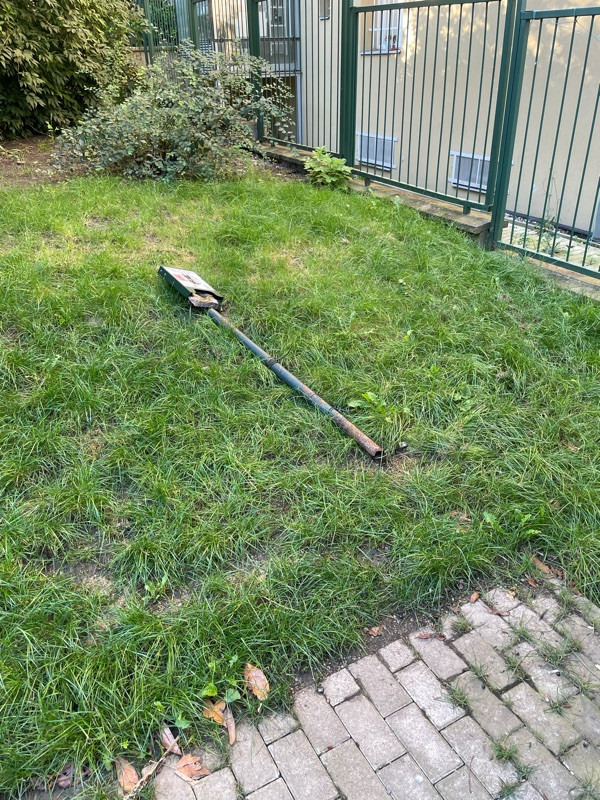 Zlomený sloupek s psími pytlíky ve vnitrobloku Radhošťská