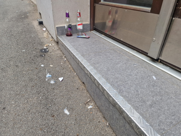 Dnes ráno opět nepořádek před domem, vajgly na ulici, lahve, ...