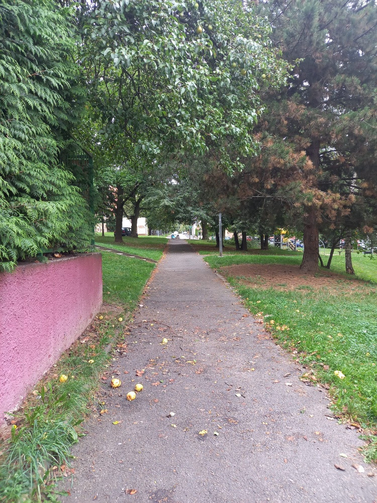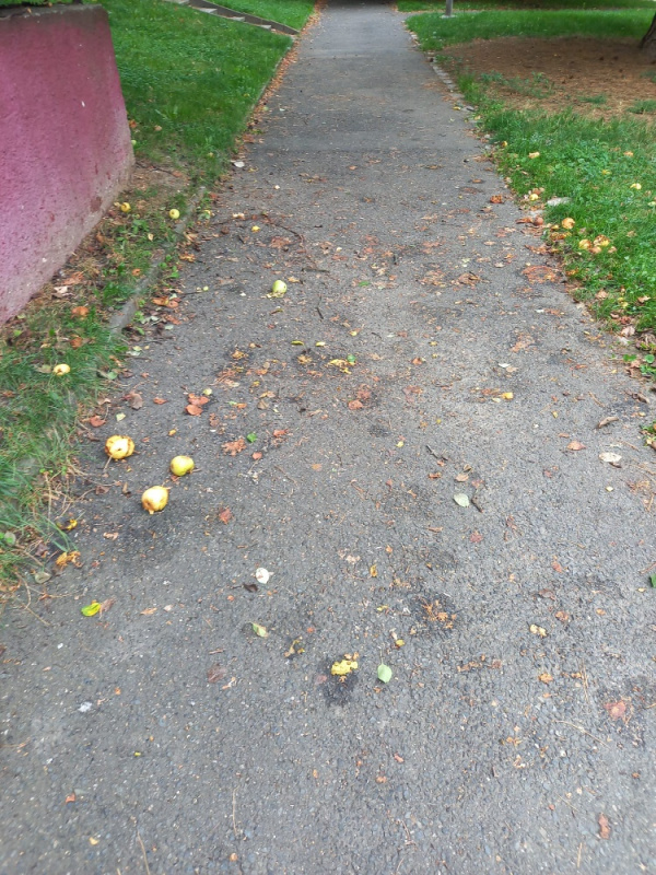 Prosim o uklid toho chodniku, ktery je kazdym rokem znecistovan hruskou okolniho baraku, ktera stoji na uzavrenem vnitrobloku.Jiz nahlasovano minuly rok, bylo by dobre vyzvat majitele toho baraku ke zastrizeni teto hrusky.Na chodniku leti spousta hrusek a pritahuji spousty vos i dokonce srsni, pro alergickeho cloveka by toto mohlo byt i smrtelne, blizko je navic detske hriste.