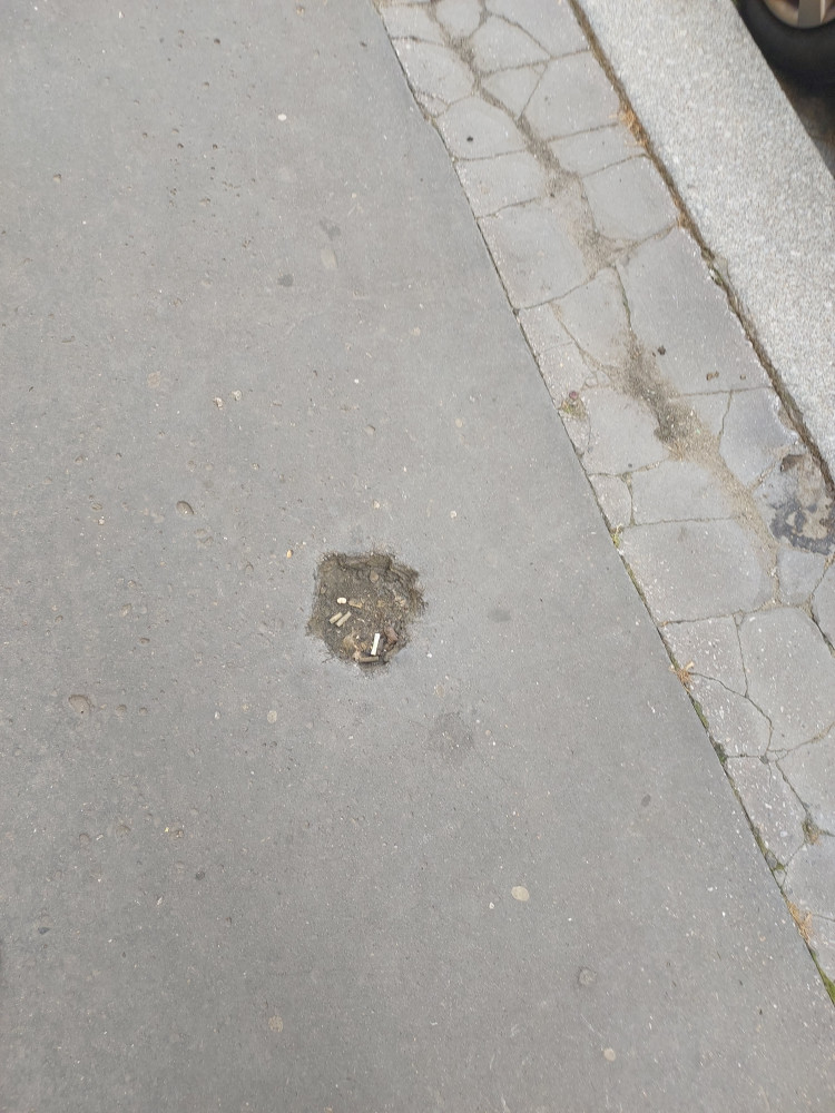 Díra v chodníku. Nějaké dítě do ní najelo koloběžkou a letělo. Asi by chtělo zadelat.
