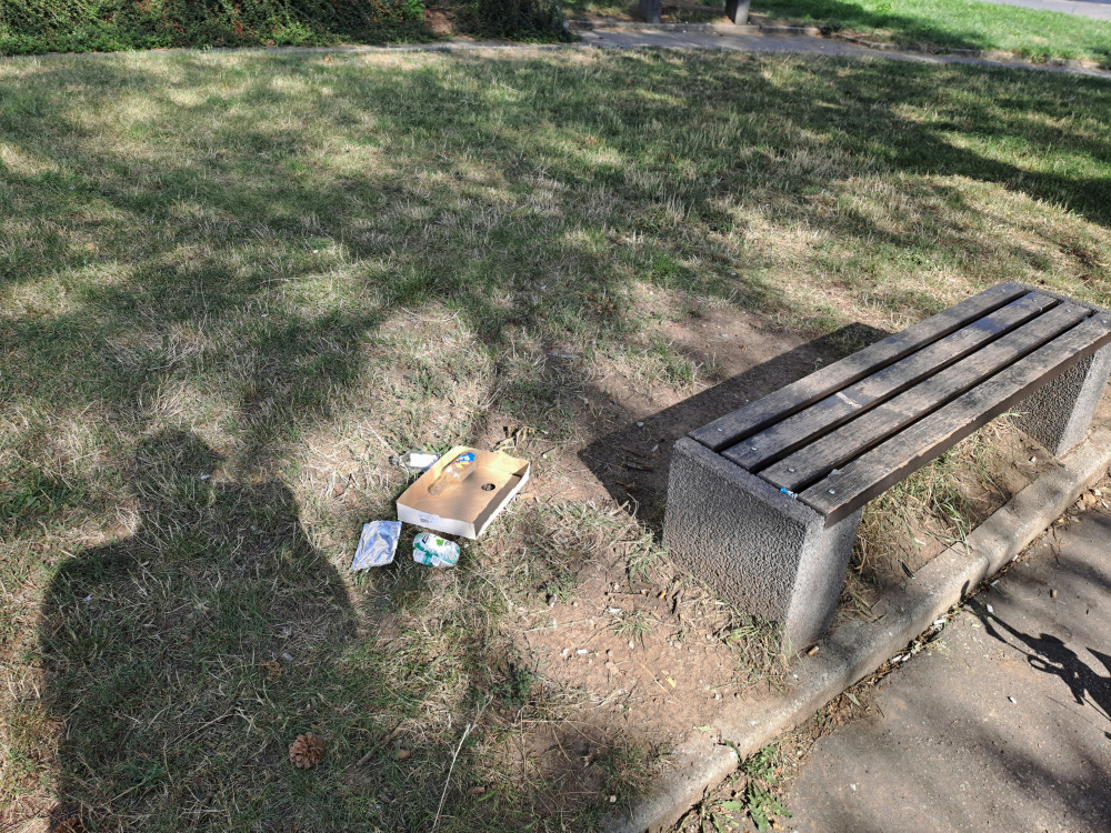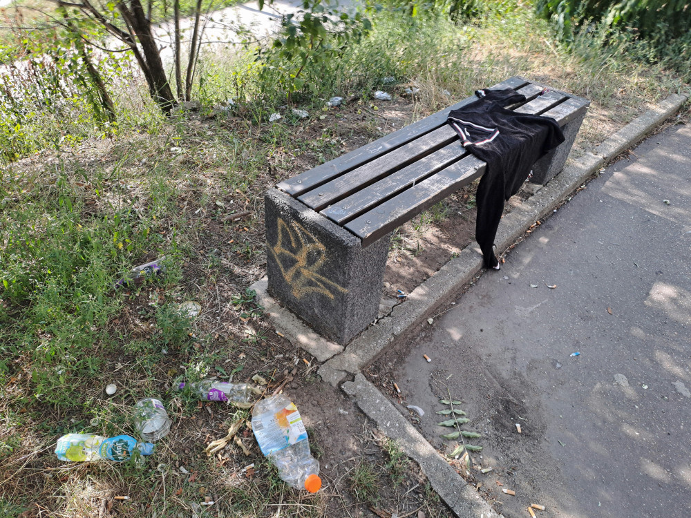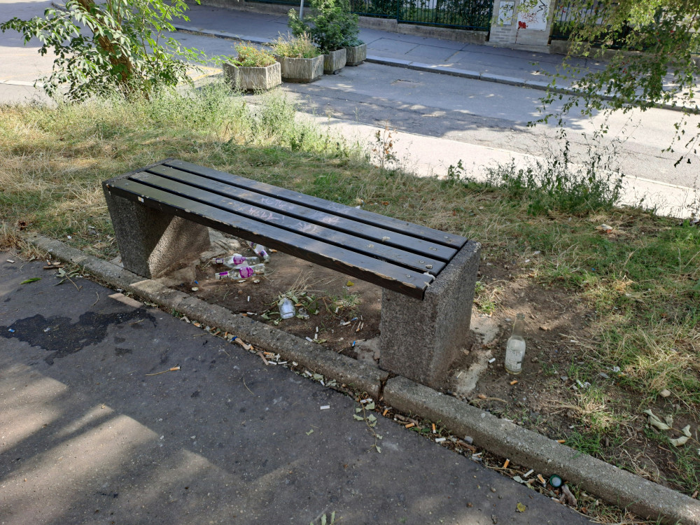 Pohazene odpadky, flasky kolem lavicek pred budovou koleji VSE. Dekuji