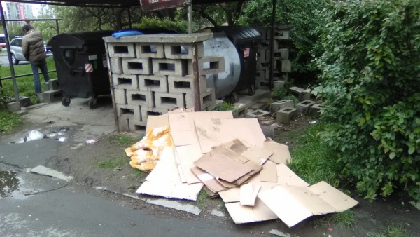 Černá skládka v zeleni vedle kontejnerového stání.