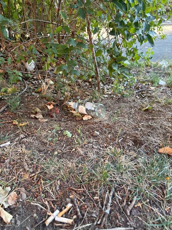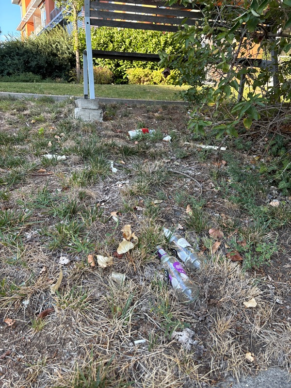 Skleněné láhve okolo lavičkek a jiné odpadky