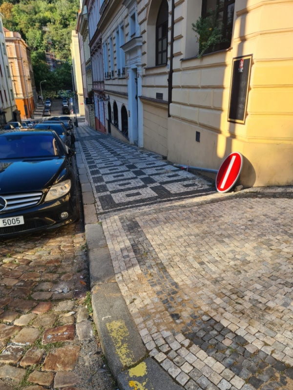 Někdo vyndal značku a opravil chodník v Jeronýmova ulice která je jako jednosměrná. Momentálně je v ulici pěkný zmatek protože tam projede jen jedno auto.