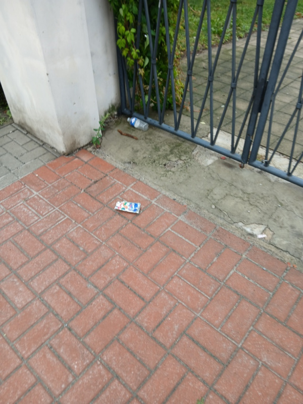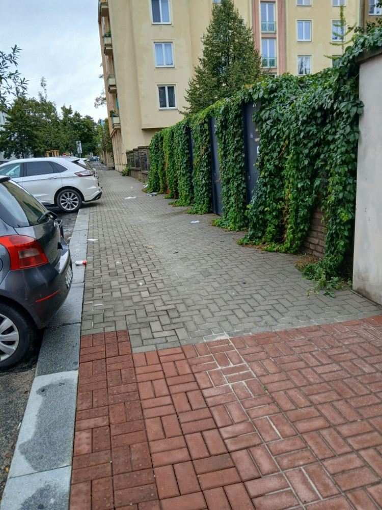 odpadky na chodniku, podel plotu vnitrobloku za zizkovskou vozovnou