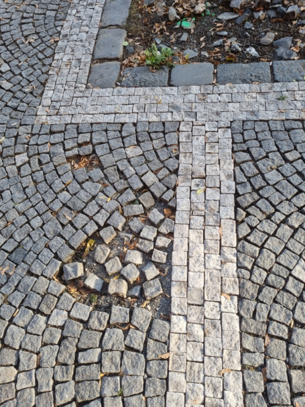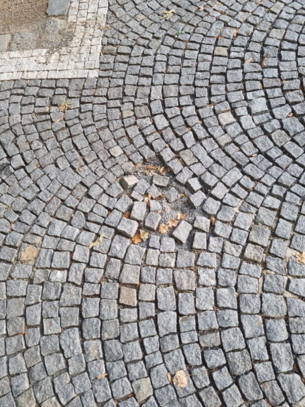 Rozpadlá dlažba před domem Roháčova 81 a 83.