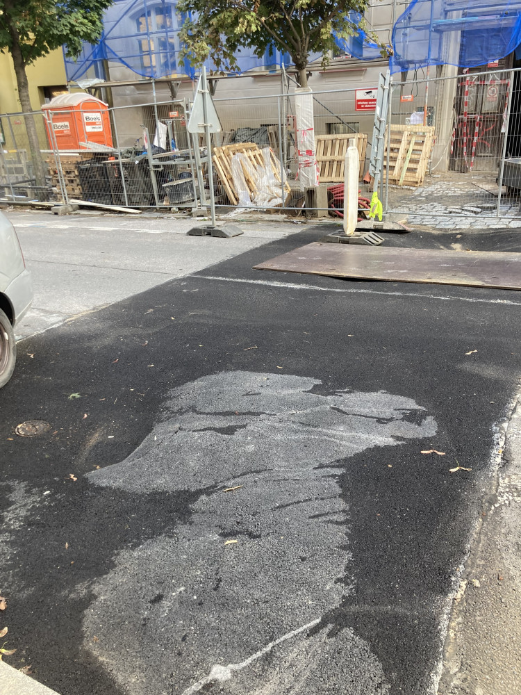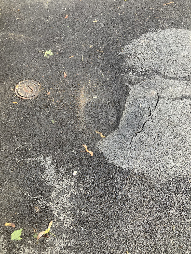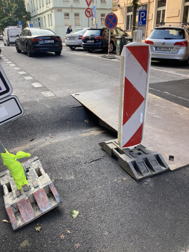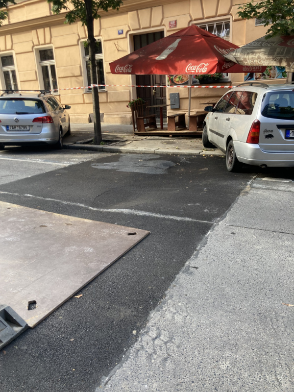 Propadlá vozovka (celý pruh před několika týdny asfaltovan)