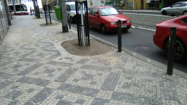 Nějaký borec zboural sloupky v chodníku, ty se tam válejí, dllažba je vylámaná, válí se všude. Dlažba je poškozena i na dalších místech.