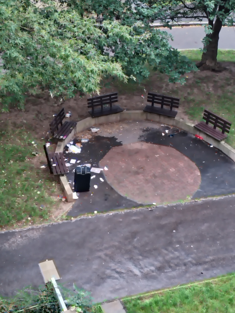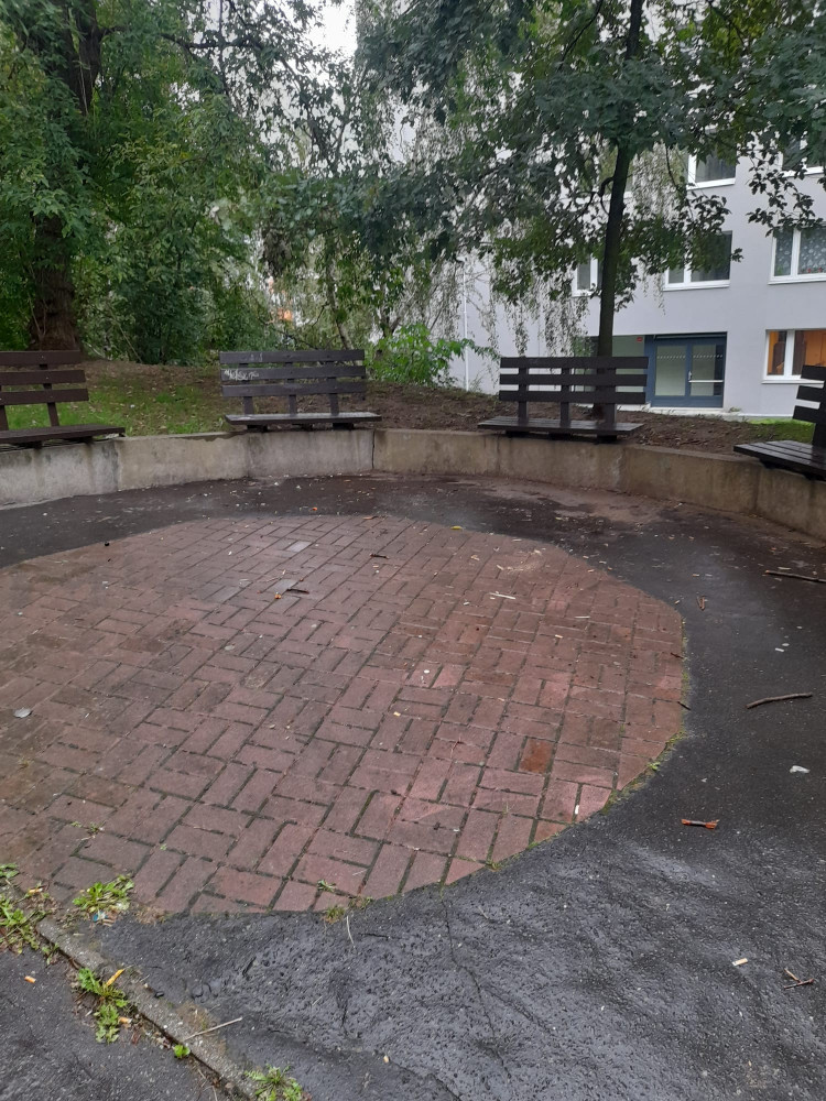 Nepořádek ve vnitrobloku panelových domu, hlavně u laviček.