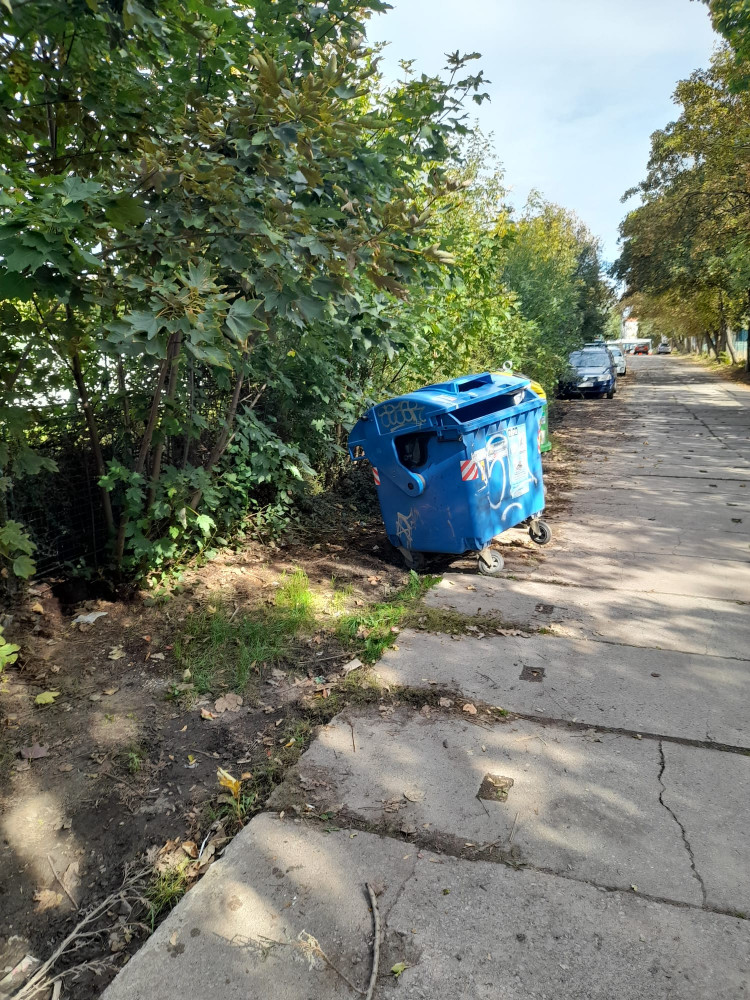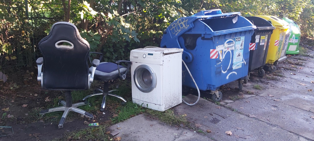 Odložená pračka a židle u kontejnerů na tříděný odpad