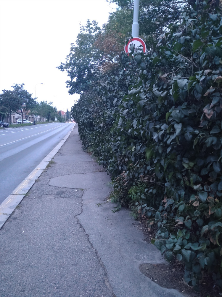 Šeříky u chodníku v Soběslavské pod křižovatkou s Votickou opět dorostly do půlky chodníku, po kterém se tak dá sotva projít.