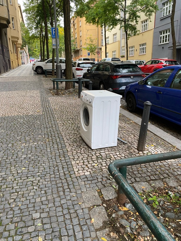 Již několik dní odložená pračka na chodníku. Už ji někdo začal využívat místo koše a plní se odpadky