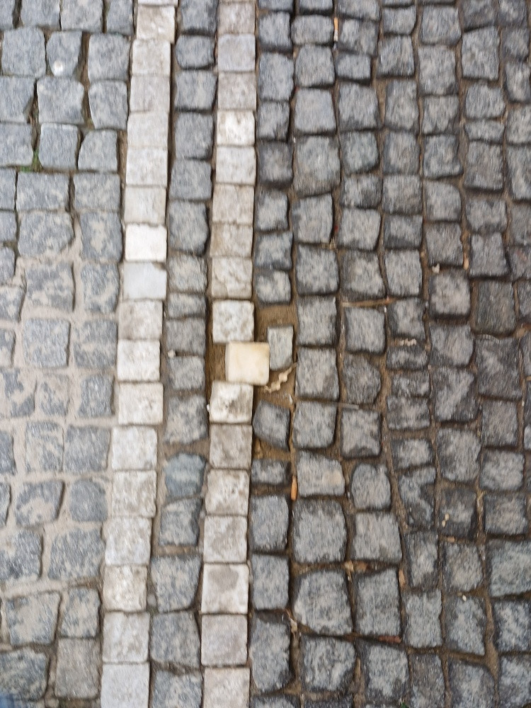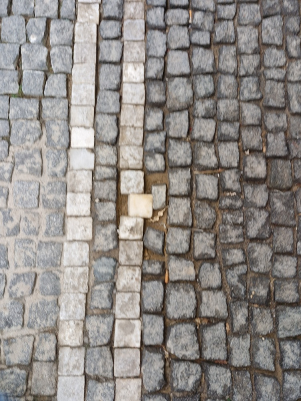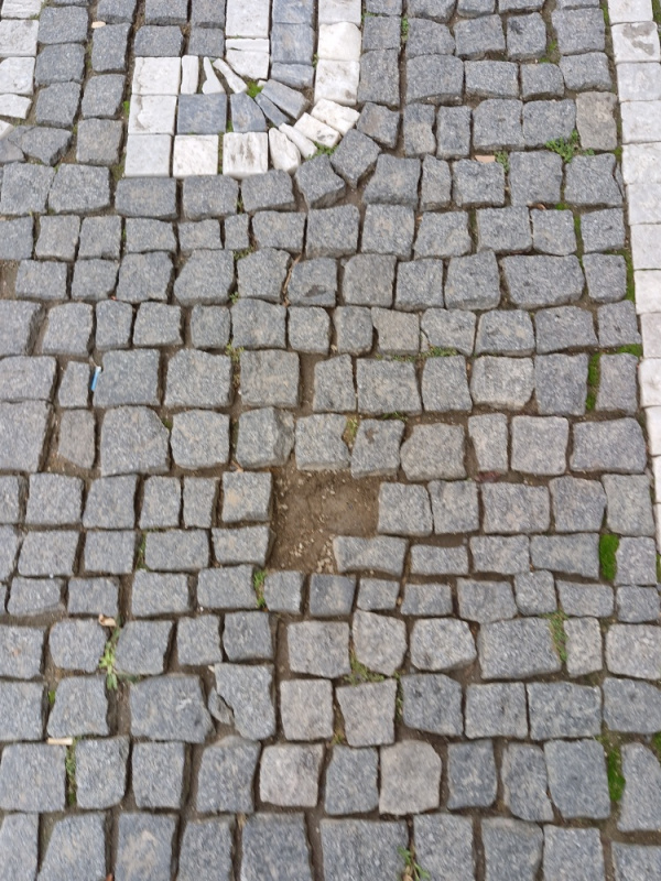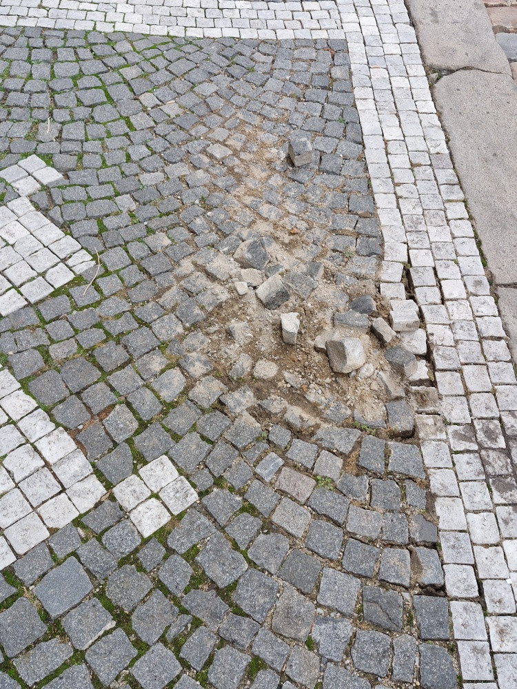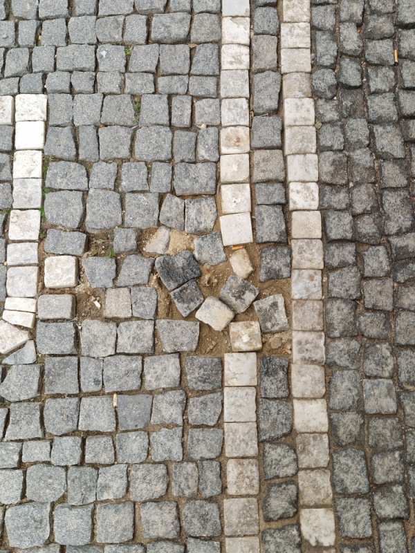 Na několika místech poničená dlažba chodniku pred domem Kubelíkova 27 (i v ul. Víta Nejedlého).