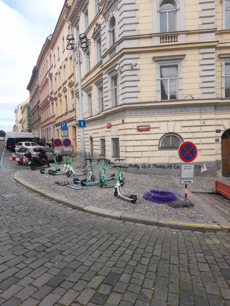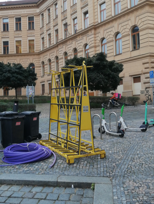 Bezprizorní stojan na chodníku, již nejméně třetí týden.