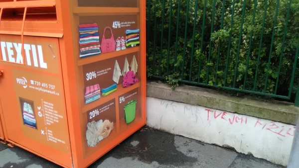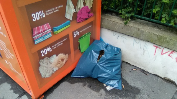 Pytel odpadu a nepořádek u kontejneru na textil.