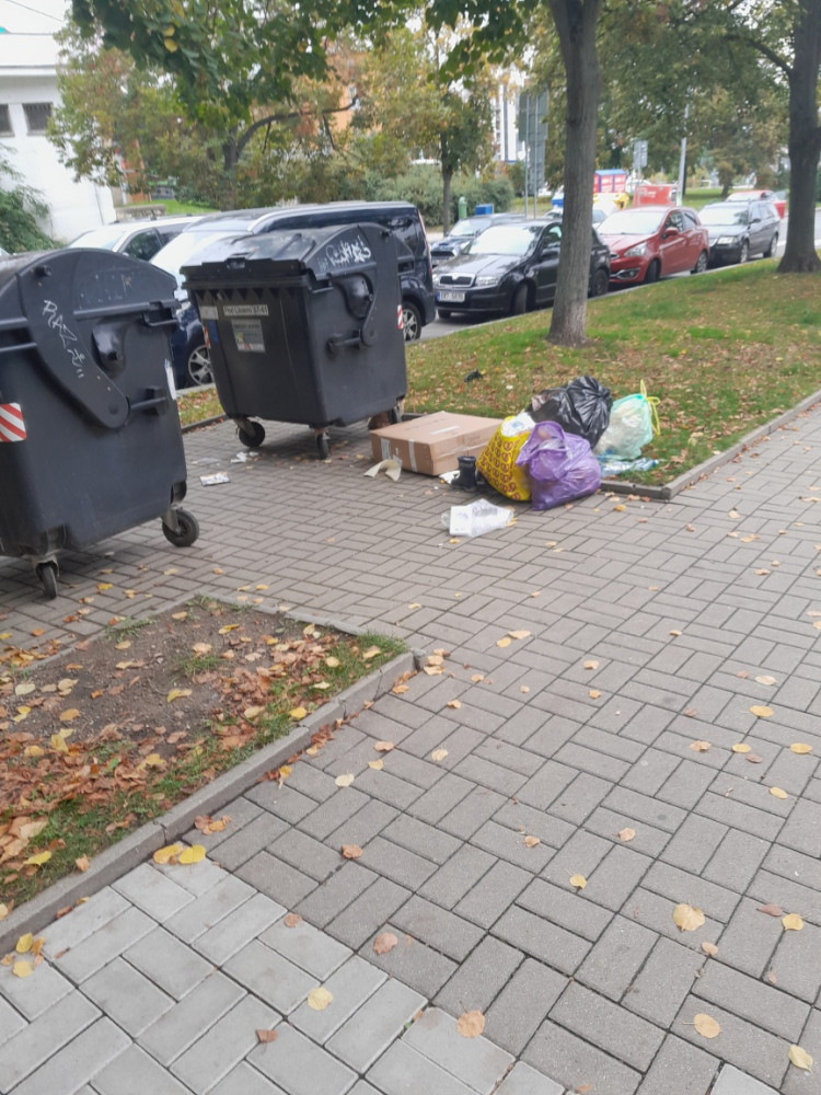 Hromada nepořádku. Dnes ráno popeláři vyvezli kontejnery, ale v okolí zůstaly pytle, krabice, boty..