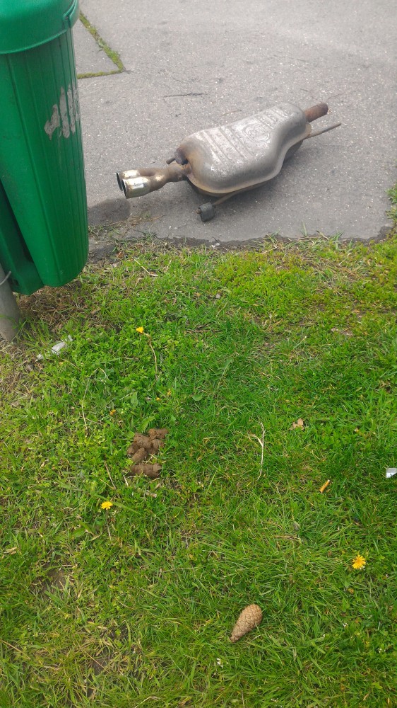 Psí výkaly a odložený výfuk na rohu j. Želivského a basilejske nam.